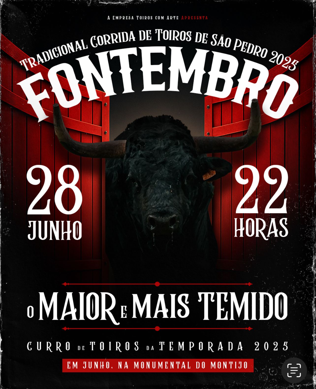 Dia 𝟐𝟖 𝐝𝐞 𝐣𝐮𝐧𝐡𝐨, 𝐧𝐚 𝐓𝐫𝐚𝐝𝐢𝐜𝐢𝐨𝐧𝐚𝐥 𝐂𝐨𝐫𝐫𝐢𝐝𝐚 𝐝𝐞 𝐓𝐨𝐢𝐫𝐨𝐬 𝐝𝐞 𝐒ã𝐨 𝐏𝐞𝐝𝐫𝐨 na Monumental Amadeu Augusto dos Santos estão já anunciados os MAIORES e mais TEMIDOS toiros da temporada – 𝐅𝐎𝐍𝐓𝐄𝐌𝐁𝐑𝐎 para uma noite que se espera de emoções à flor da pele.