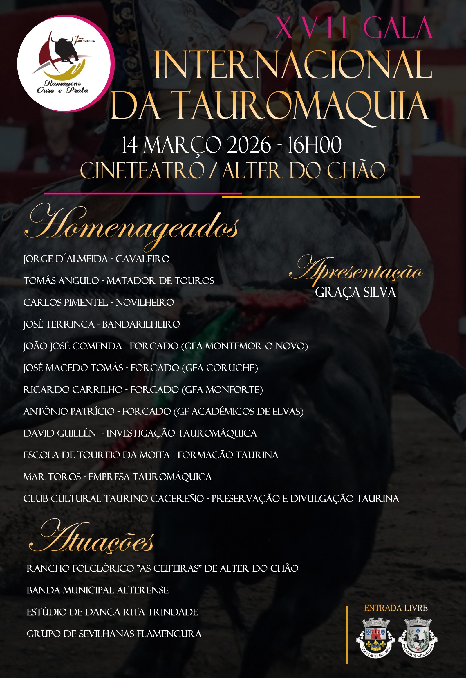 No próximo 14 de março de 2026, às 16h00, o Cineteatro de Alter do Chão será palco de mais uma edição de excelência da Gala Internacional da Tauromaquia, um momento maior de celebração, reconhecimento e exaltação da cultura taurina.